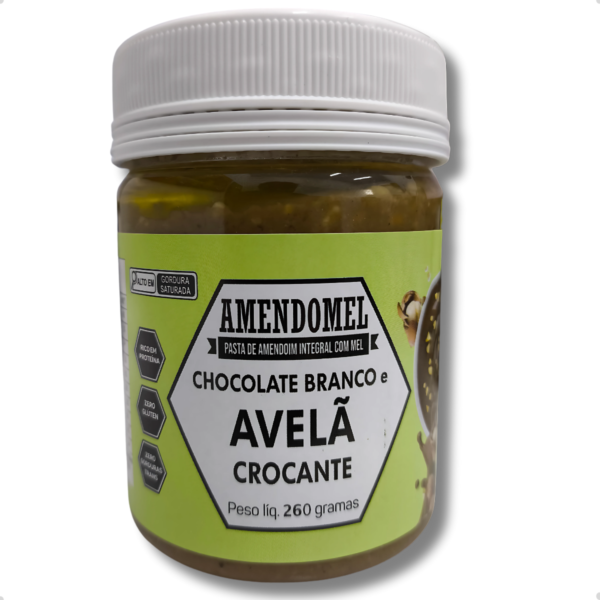 AmendoMel de Avelã é a combinação perfeita e deliciosa de Pasta de Amendoim com Mel e chocolate branco. Produto 100% Natural; Sem Conservantes, Sem Adição de Açúcar e Sem Glúten.