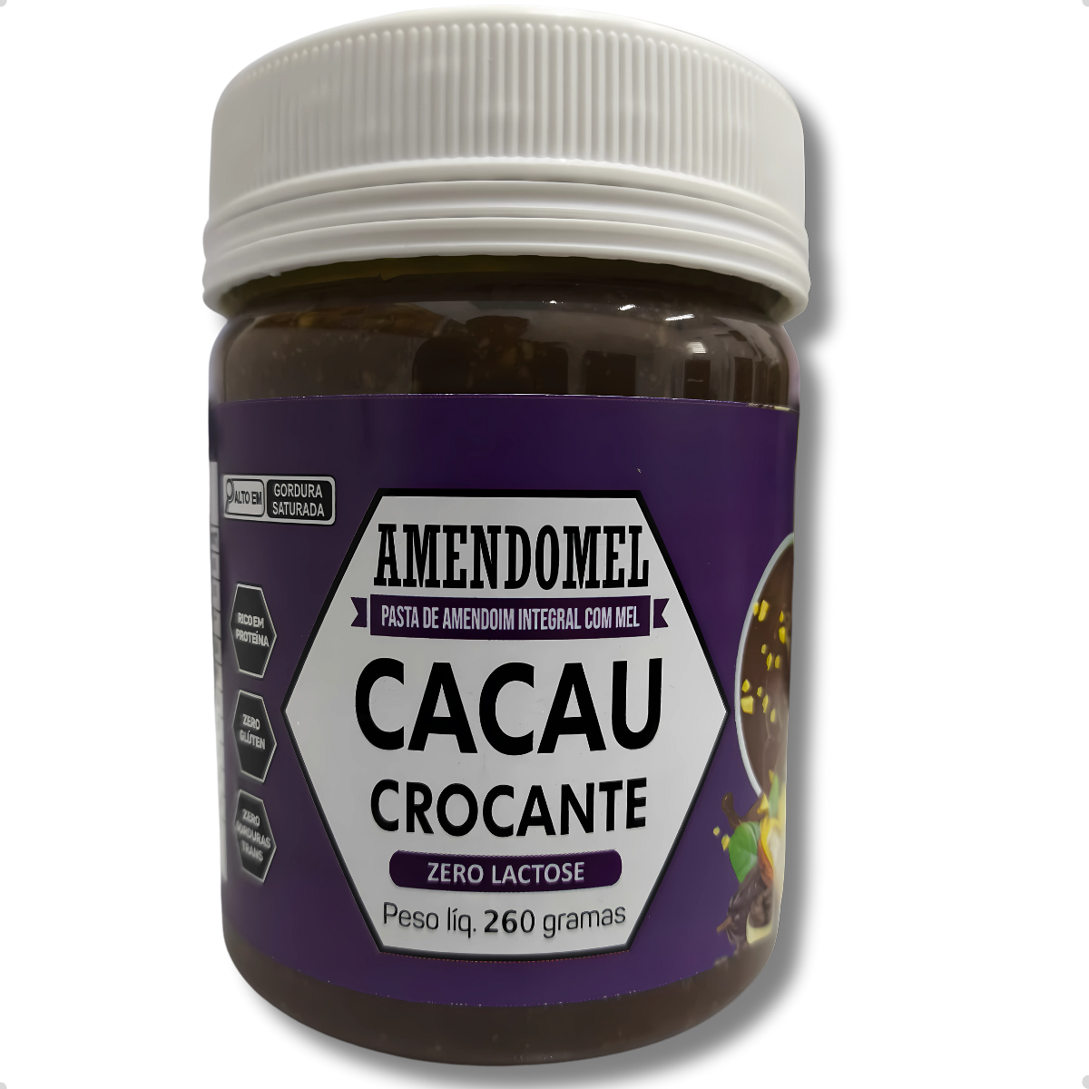 A Pasta de Amendoim crocante com Mel e Cacau é um produto 100% natural, sem conservantes, sem adição de Açúcar e sem Glúten. É um alimento saboroso rico em fibras e proteínas, proporcionando sensação de saciedade, além de ser também, rica em vitamina E, aminoácidos e ácidos graxos poli-insaturados, que auxiliam na prevenção de doenças cardiovasculares.