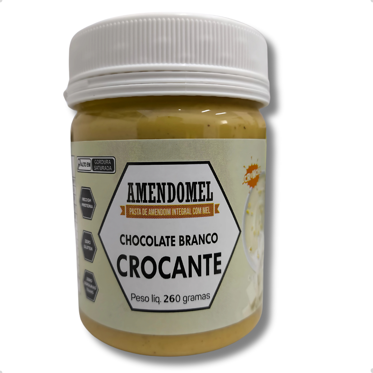 AmendoMel de Chocolate Branco Crocante é a combinação perfeita e deliciosa de Pasta de Amendoim com Mel e chocolate branco.